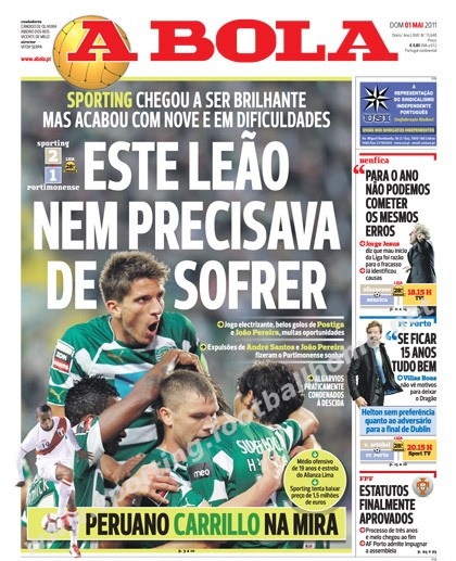Vitória justa (2-1) mas suada (Duarte Gomes fez, mais uma, arbitragem miserável expulsando dois jogadores do Sporting) em Alvalade frente ao Portimonense e notícia da 1ª contratação para 2011-12 (Carrillo).