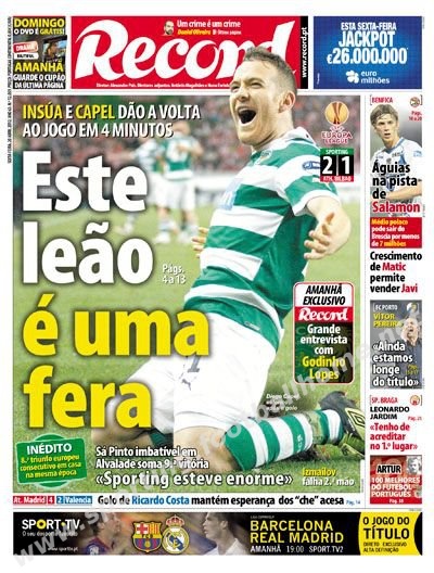 Vitória na 1ªmão da meia-final da Europa League frente ao Athletic Bilbao (2-1).