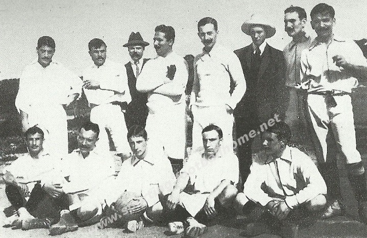 Em cima, da esquerda para a direita: Albano dos Santos, Henrique Costa, Charles Etur (de chapéu preto), Emílio de Carvalho, Viegas, José Belo (de chapéu branco), António Bentes e António Couto.
