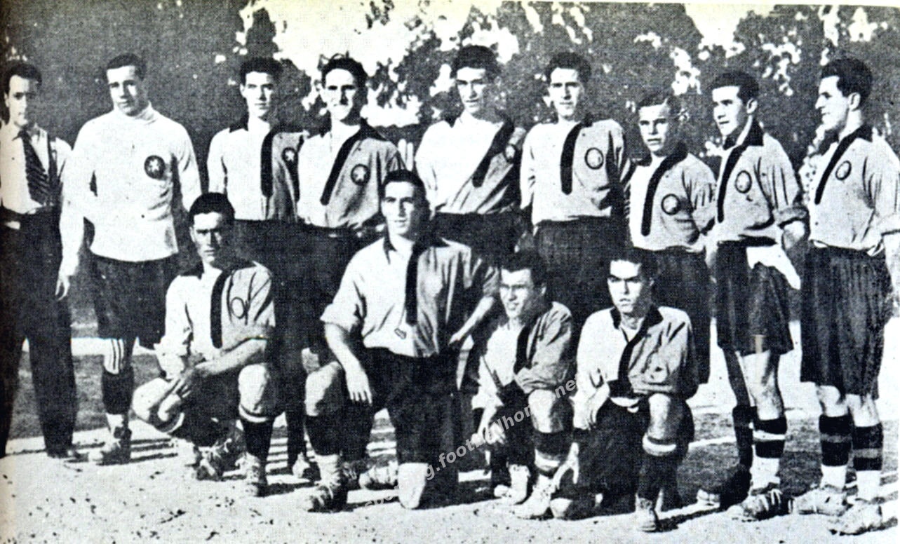 Em cima, equipados, da esquerda para a direita: Cipriano dos Santos, Martinho de Oliveira, Abrantes Mendes, Filipe dos Santos, Matias, Agostinho Cervantes, José Manuel Martins e Jorge Vieira.