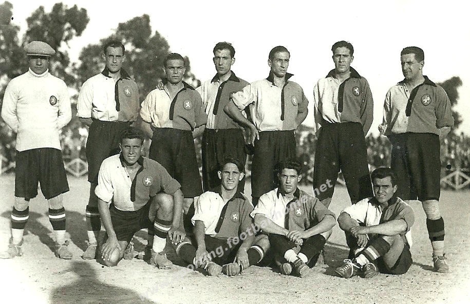 Em cima, da esquerda para a direita: Cipriano dos Santos, António Penafiel, Agostinho Cervantes, Alfredo Sousa, Francisco Serra e Moura, Manuel Matias e Jorge Vieira.