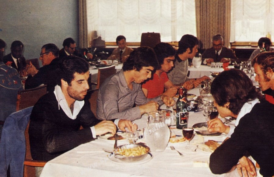 Em estágio na véspera da partida com o Magdeburg para as meias-finais da Taça das Taças, jogadores, direcção e staff técnico em refeição.