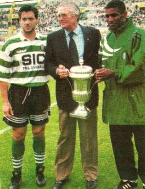 Momento simbólico em que os capitães Oceano e Carlos Xavier entregam a Supertaça, conquistada diante do Porto (3-0) em Paris, ao Presidente José Roquette, antes do jogo Sporting-Chaves.