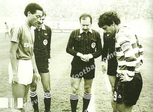Capitães de equipa (Shéu e Manuel Fernandes) observam o árbitro Vítor Correia a lançar a moeda ao ar.
