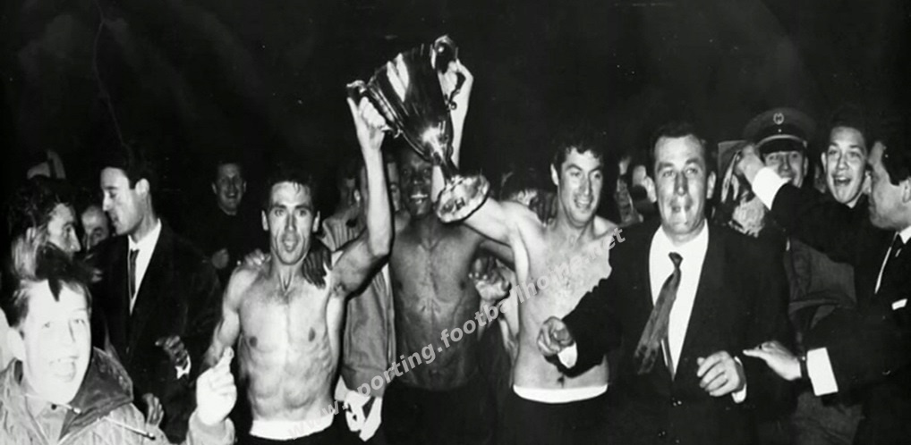 Após a entrega da Taça, Figueiredo, Mascarenhas e Fernando Mendes celebram com os adeptos leoninos presentes em Antuérpia.