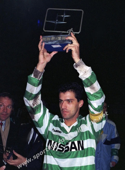 Carlos Xavier erque o troféu referente à vitória no Torneio Philips Lisboa vencendo o Ajax na final por 2-0.