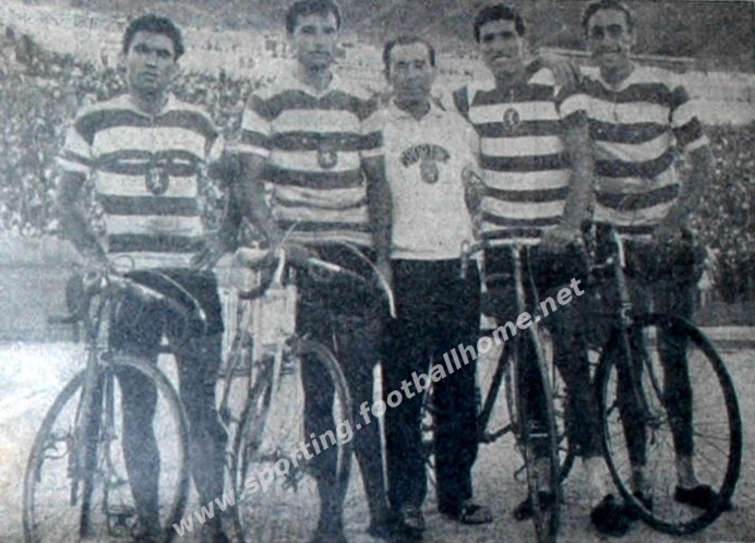 Américo Raposo, Pedro Polaindas, António Pereira, José Calquinhas e Pedro Júnior no Estádio José Alvalade no final da Volta a Portugal de 1957.