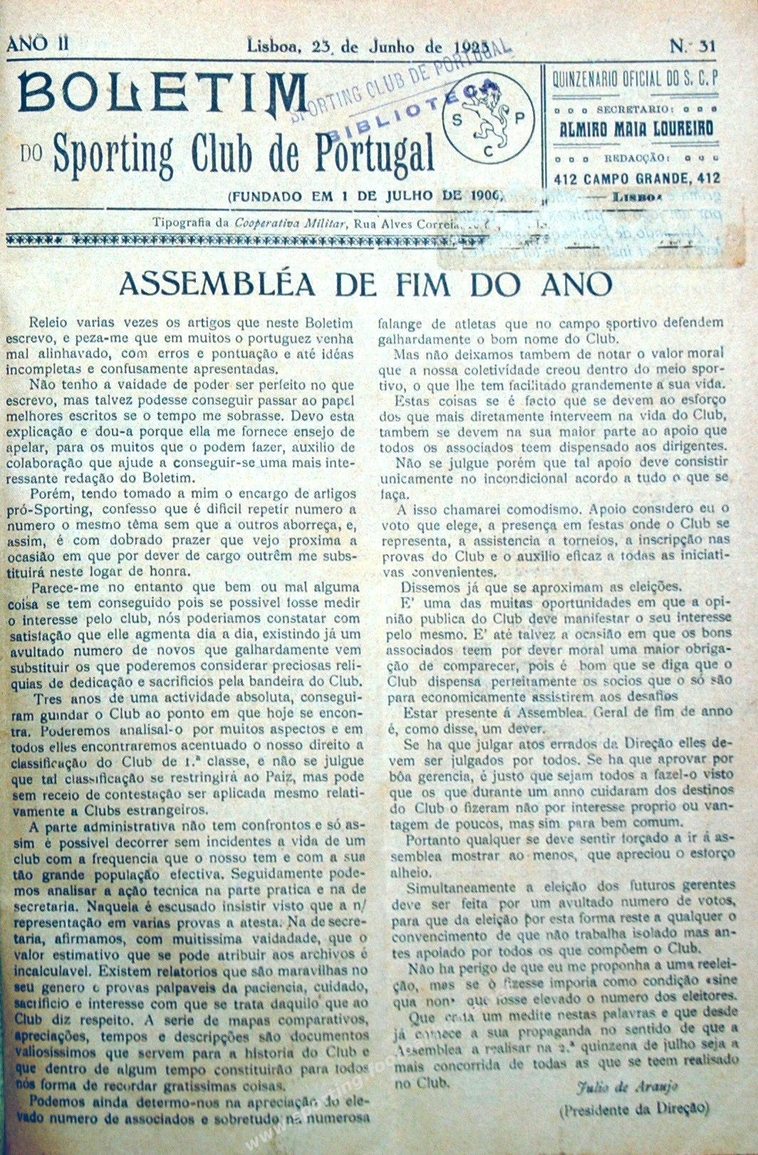 Boletim do Sporting Clube de Portugal destacava a Assembleia de fim da época 1922-23.