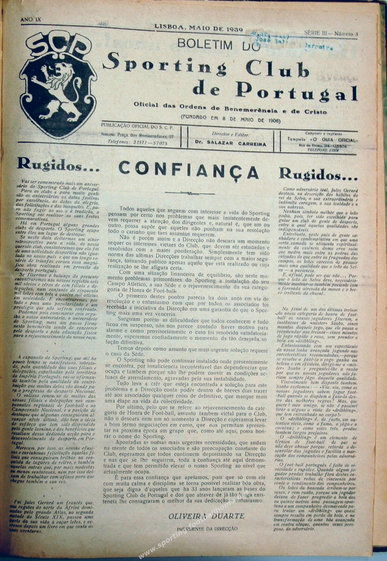 O Presidente Oliveira Duarte dirigia-se aos sócios através do Boletim do Sporting Clube de Portugal.